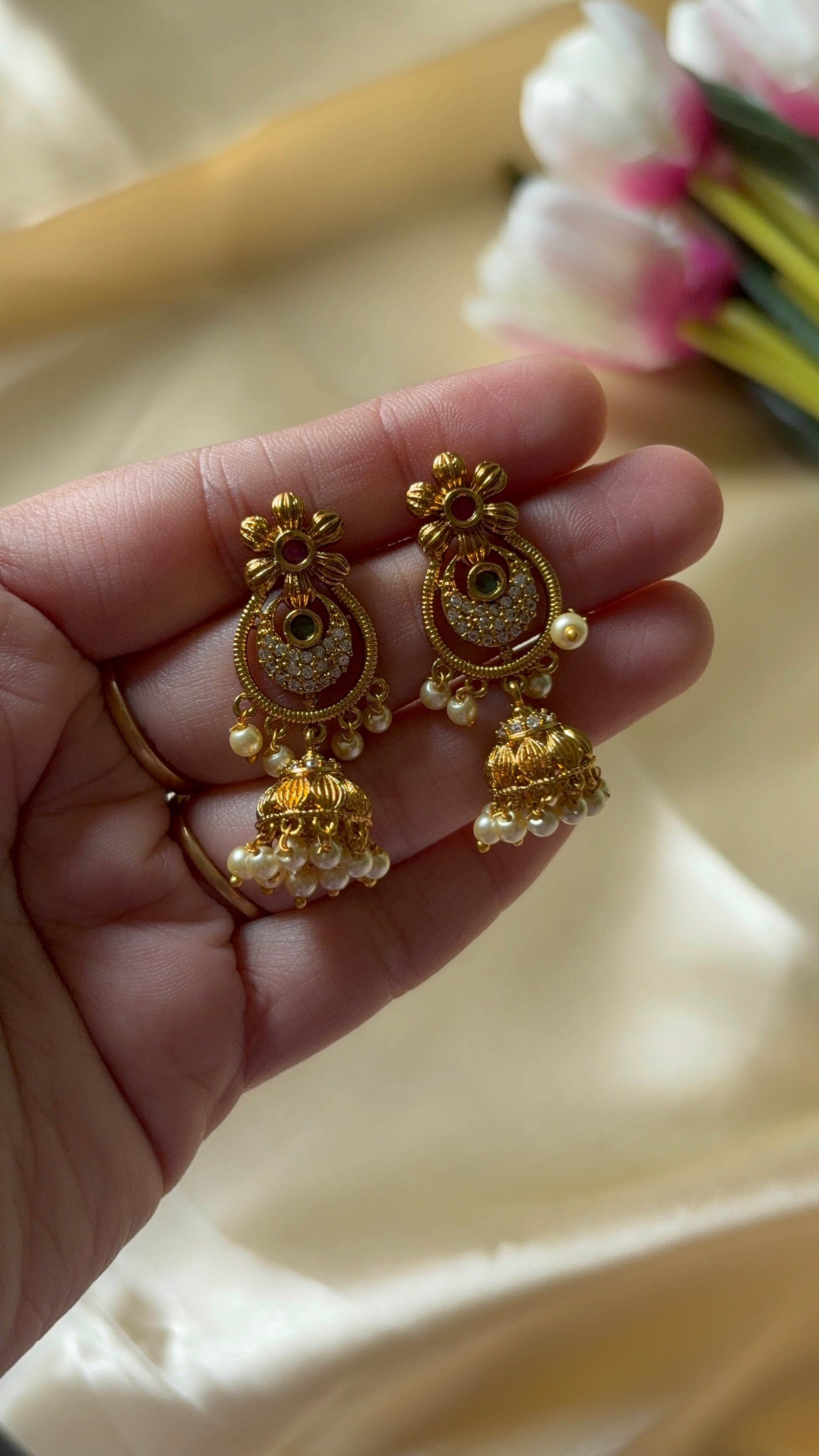 Antique Gold Finish Floral Chandbali Jhumka
